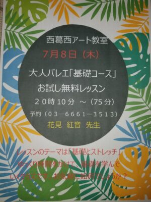 大人バレエ 7月8日(木)20時10分より、「基礎コース」無料お試しレッスンを行います。